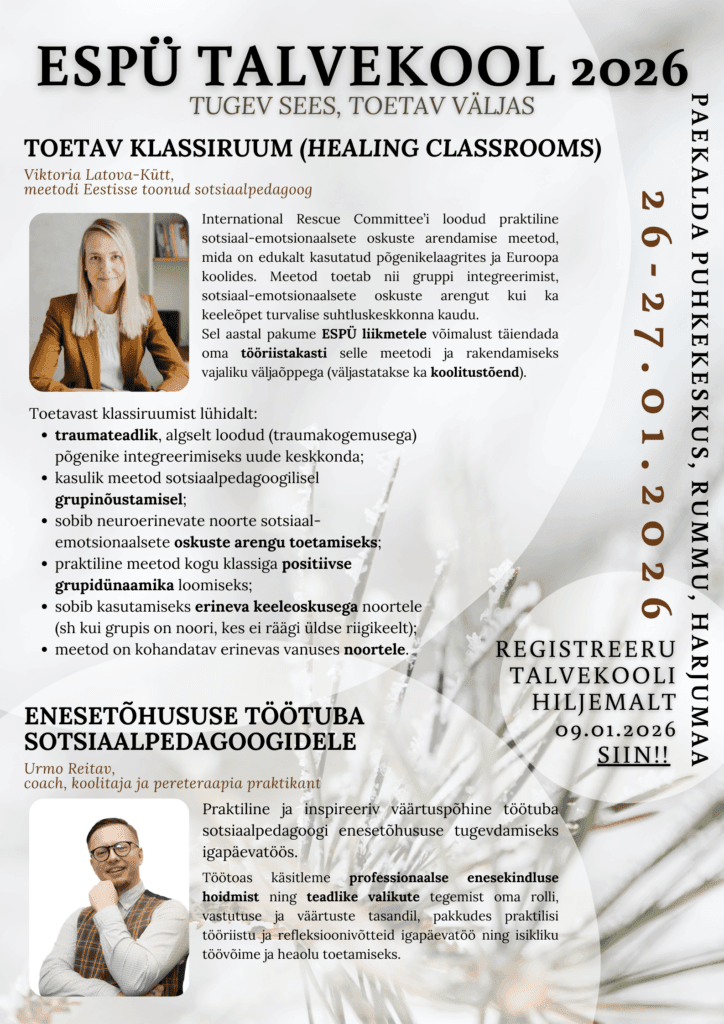 Olete väga oodatud ESPÜ talvekooli, mille käigus “avame” toetava klassiruumi ukse ja osaleme enesetõhususe töötoas. Kohtume 26.01-27.01.2026 Paekalda Puhkekeskuses (Rummu, […]